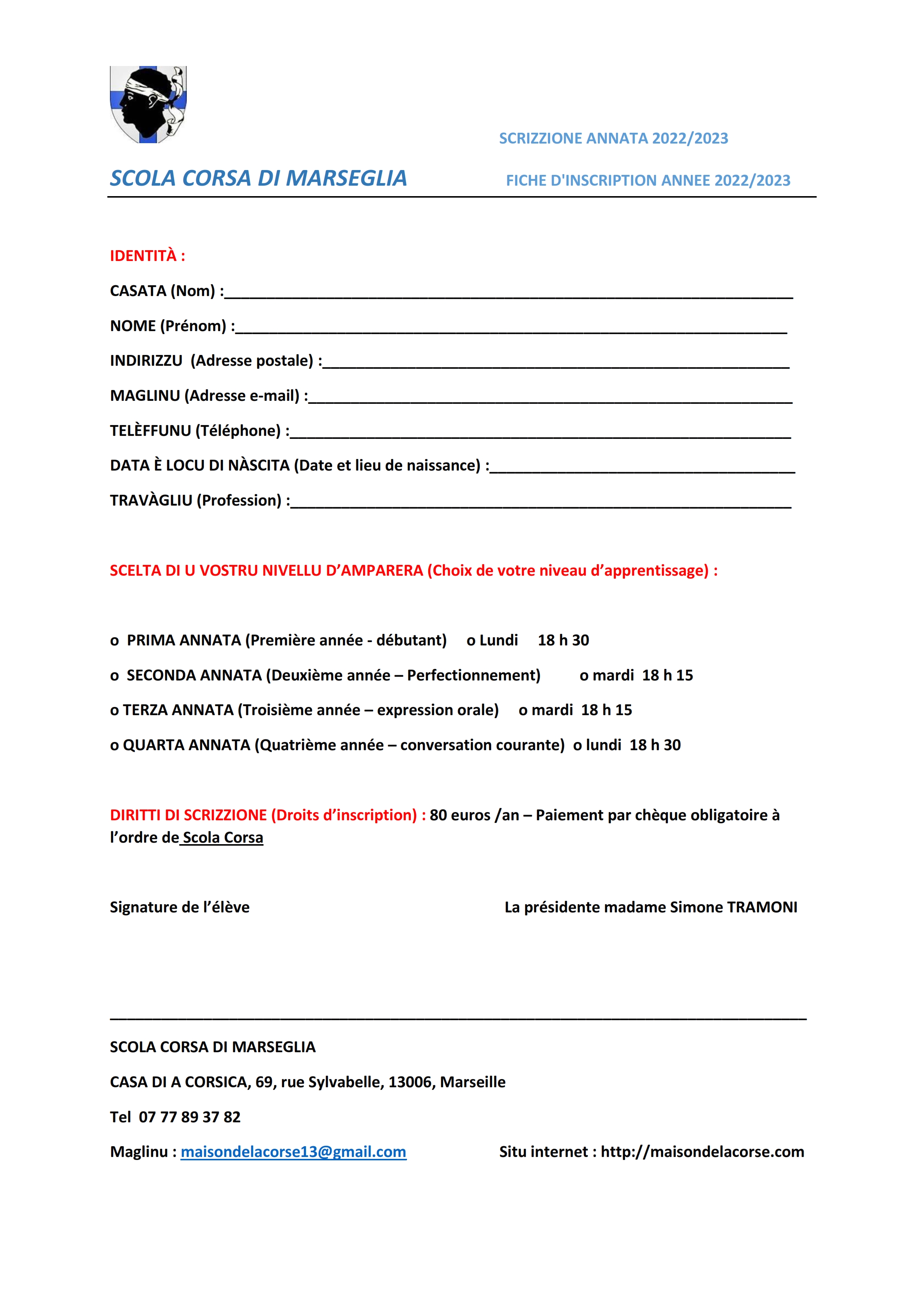 Les inscriptions pourront se faire à l’aide de la fiche ci-jointe qui sera remise au secrétariat de la Maison de la Corse accompagnée d’un chèque de 80 euros à l’ordre de Scola Corsa. Cela sera possible lors de notre assemblée générale du 30 septembre, avant cette date par voie postale ou ultérieurement. Des fiches d’inscription seront également à votre disposition à notre secrétariat.