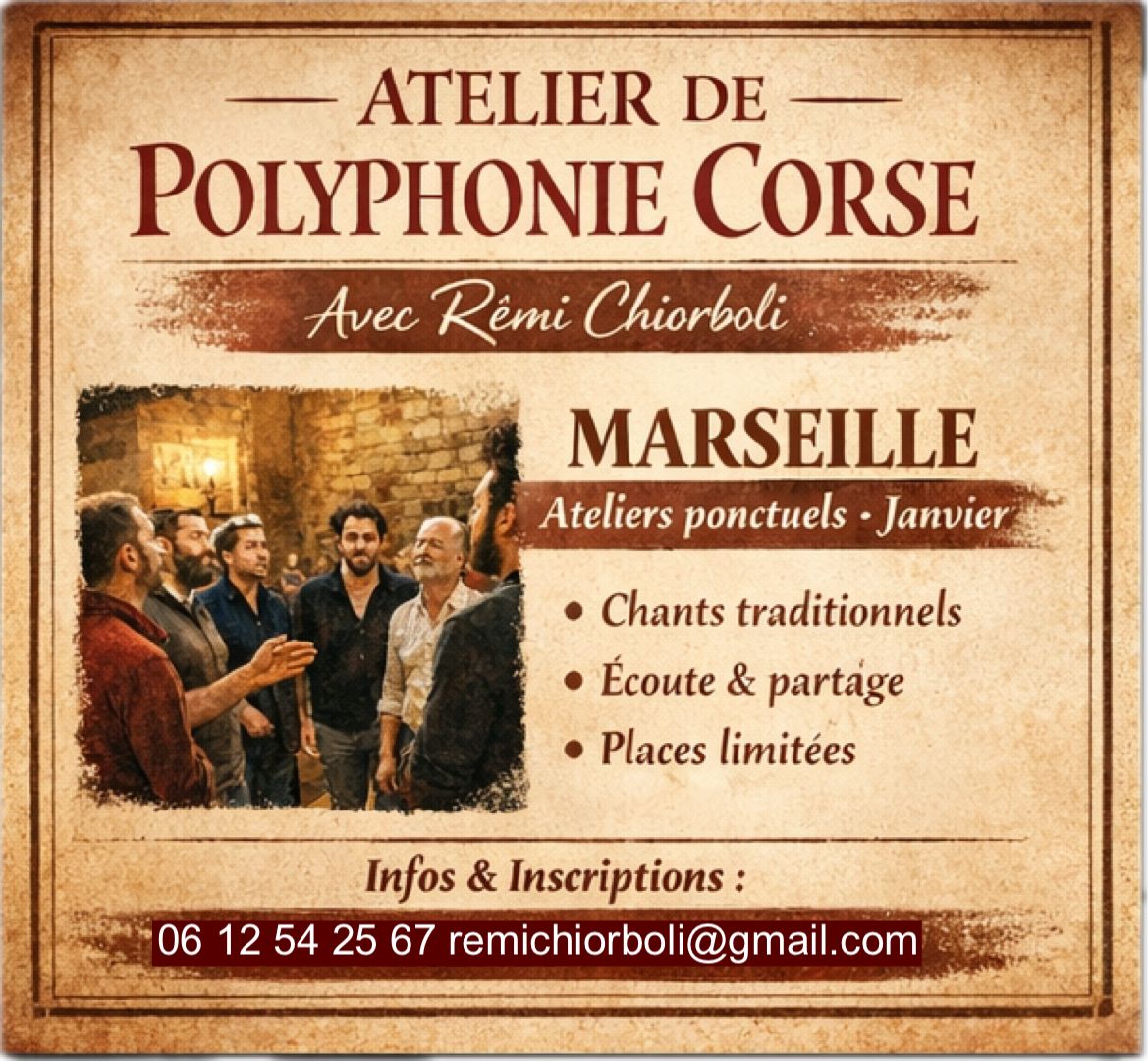 À partir du mois de janvier, un atelier de polyphonie corse sera proposé une fois par mois, pour une séance de 3 heures, dans un esprit de transmission, d’écoute et de partage.